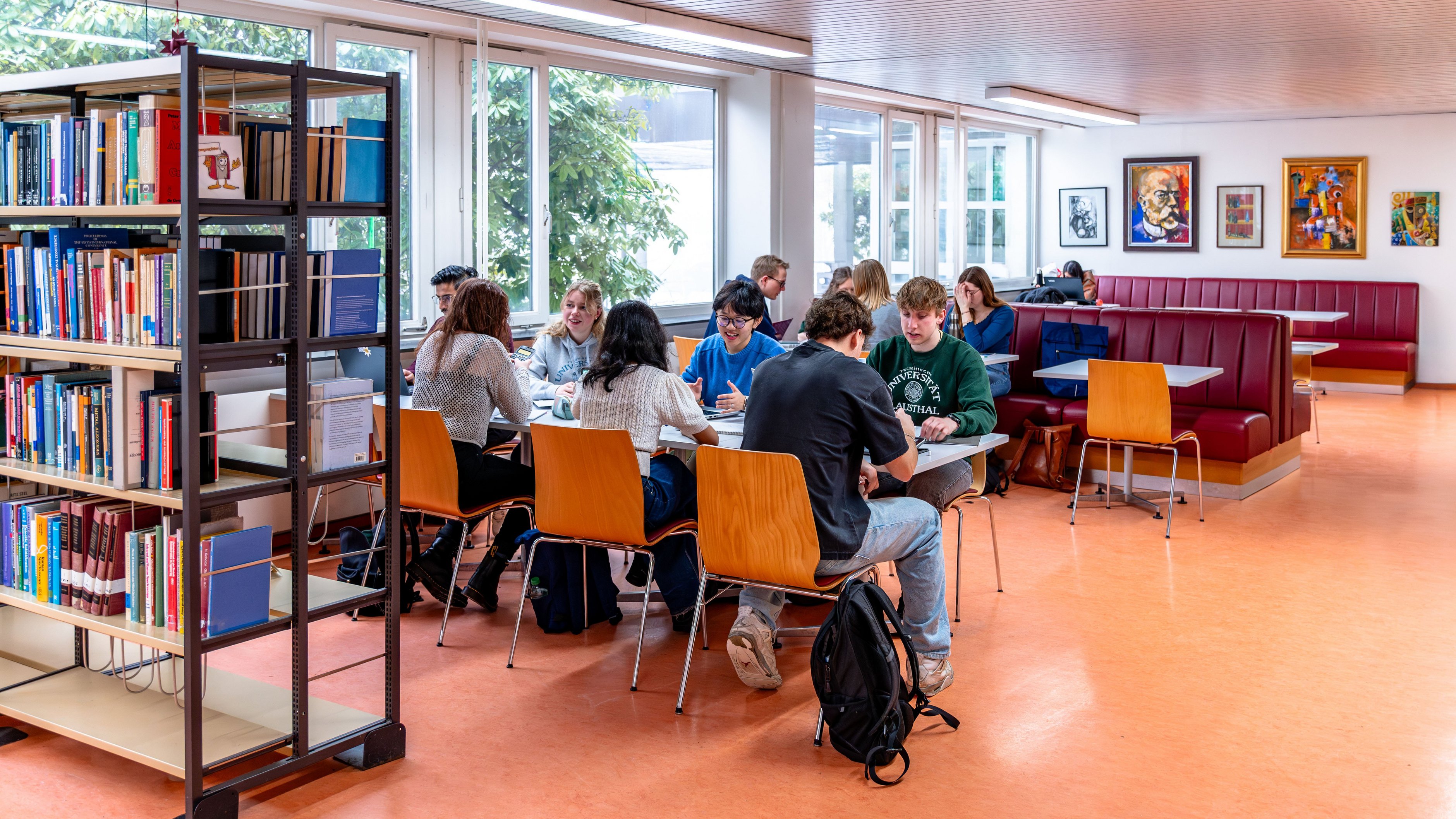 Die Cafeteria ist der kommunikative Bereich in der Bibliothek, um eine Lernpause einzulegen und sich mit Kaffee und Snacks zu stärken. Hier ist der richtige Ort, um in kleinen und größeren Gruppen zu arbeiten, sich zu unterhalten und kreative Ideen auszutauschen und zu vertiefen. Oder einfach auch mal um abzuschalten....