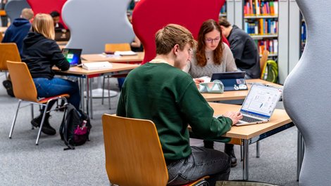 Die Bücher sind frei zugänglich und systematisch nach der Regensburger Verbundklassifikation aufgestellt. Sie können die Bücher selbständig aus dem Regal nehmen und an der Selbstverbuchung in der Nähe vom Service-Desk ausleihen.